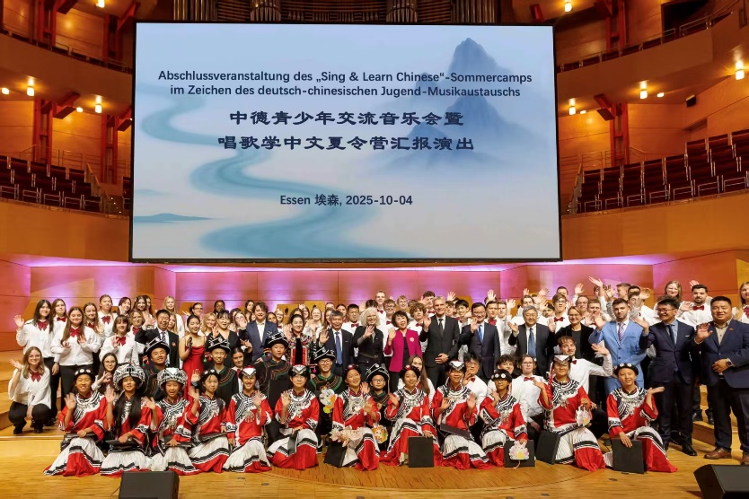 在庄严典雅的埃森音乐厅,中德青少年以合唱、重唱和器乐演奏等形式,共同演绎《茉莉花》《七月火把节》《让我们荡起双桨》等中外经典曲目,用音乐讲述跨越语言与文化的故事,展现青年一代以艺术促进沟通、以歌声增进友谊的精神风貌。